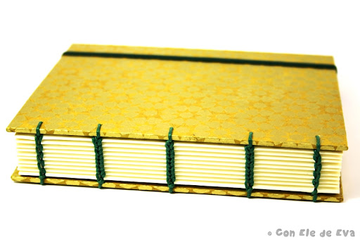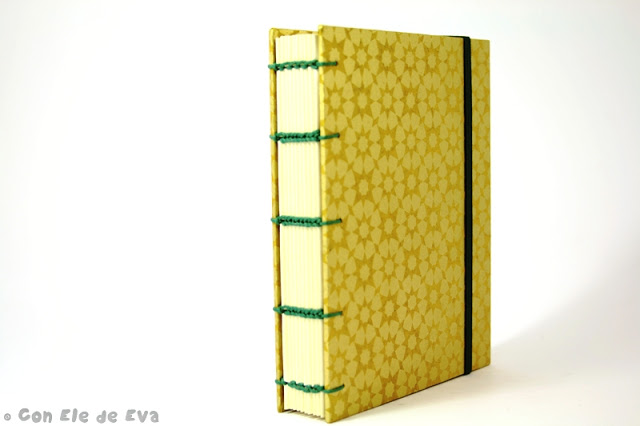 Y por último, esta es la libretita Coptik Nazarí. Está forrada en un papel Nepal que lleva impresos unos motivos en pan de oro (que me he asegurado previamente de fijar bien con barniz, porque no sabeis cómo se me puso la mesa y aquí una servidora cuando me dispuse a cortar el papel ;)).