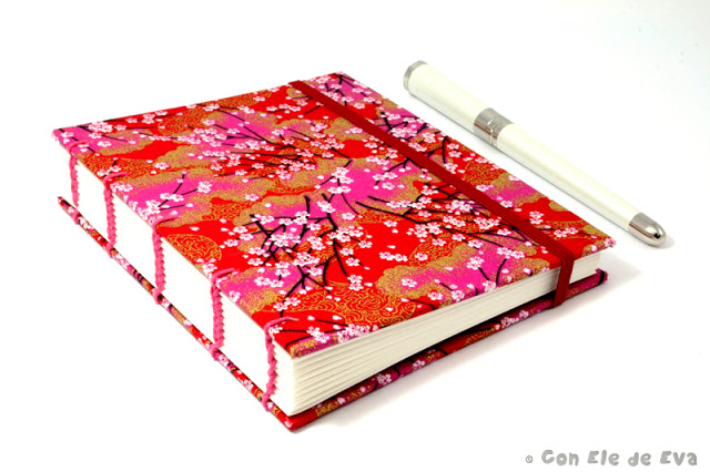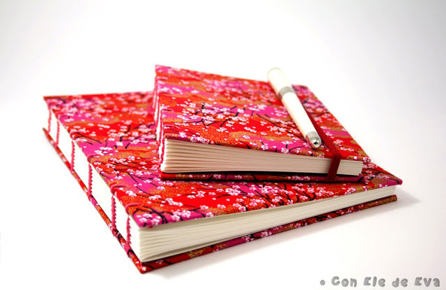Estas libretas se llaman Coptik Haru (=primavera, en japonés), y están forradas en esta preciosa tela japonesa con una fantástica explosión de color de sus cerezos en flor. Las estoy haciendo últimamente en dos tamaños diferentes, tal y como me las estais pidiendo. Aquí una pequeña muestra.