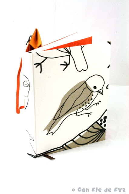 La más reciente ha sido esta libretita forrada con la misma tela de pajaritos que hace unos meses viajó a Grecia, ¿os acordais? En esta ocasión opté por ponerle un poquito más de color y utilicé un papel de Nepal en color naranja para las guardas. Y tal cual llegó se fue fly que te fly volando a su nueva casita :).