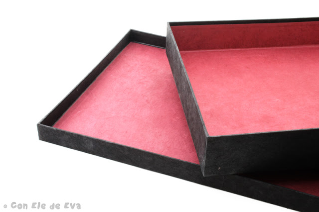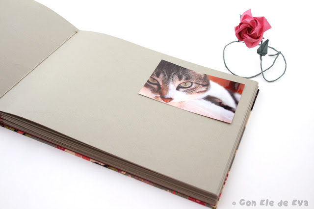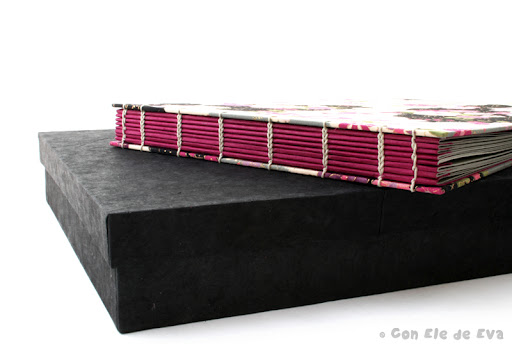 Para el album, Rosa se decantó por una tela de estampados japoneses para las tapas, papel nepal en color fucsia para las guardas y cartulinas de alto gramaje color gris-azulado para el interior. Para completar la presentación del regalo Rosa me pidió que le hiciera una caja a medida, forrada a juego con los colores del album.