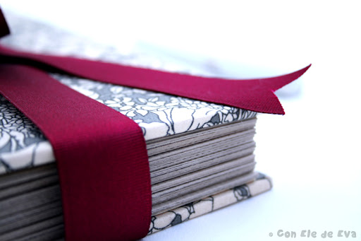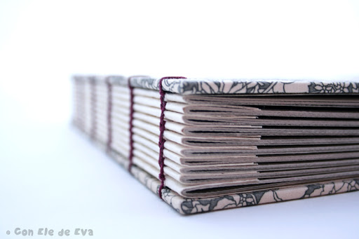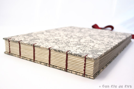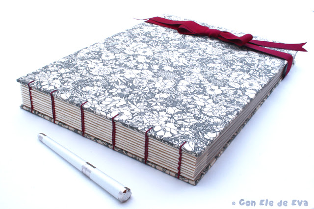 Y este fue el resultado. Un album forrado con tela de algodón con un precioso estampado floral sobre fondo gris y guardas en papel nepal, cosido con hilo de algodón. El acabado quedó elegante y delicado manteniendo al mismo tiempo ese toque moderno que ambos querían.