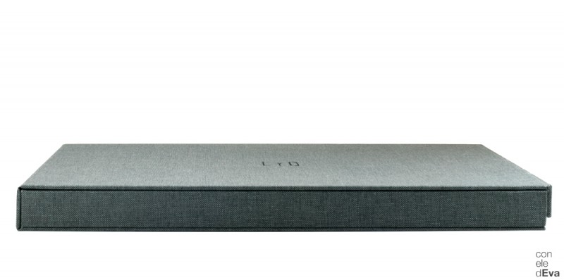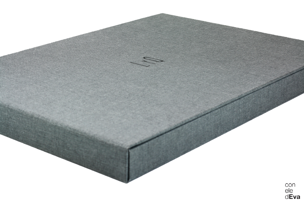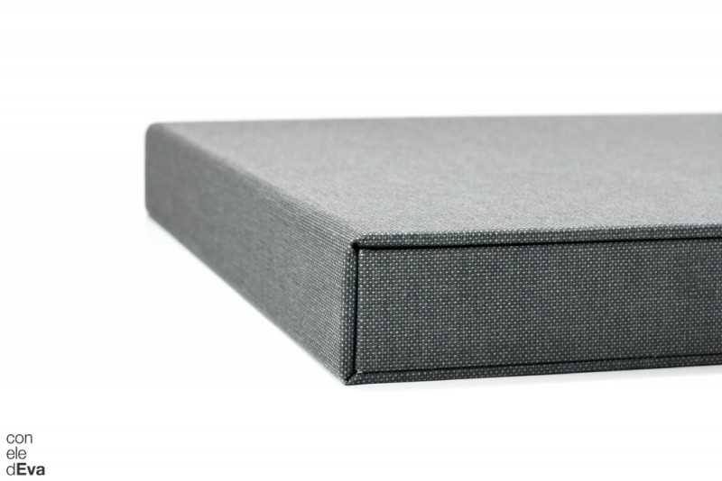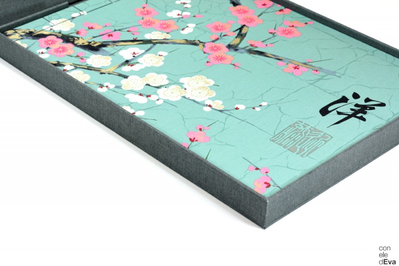 Album fotográfico fine art de 30×40 cm y 40 hojas con encuadernación japonesa, revestido con tela de algodón de diseño oriental y con papel lokta de Nepal. La caja de conservación está realizada a medida para este álbum y lleva estampado el nombre de los novios en la cubierta con tipografía personalizada a petición de la fotógrafa.